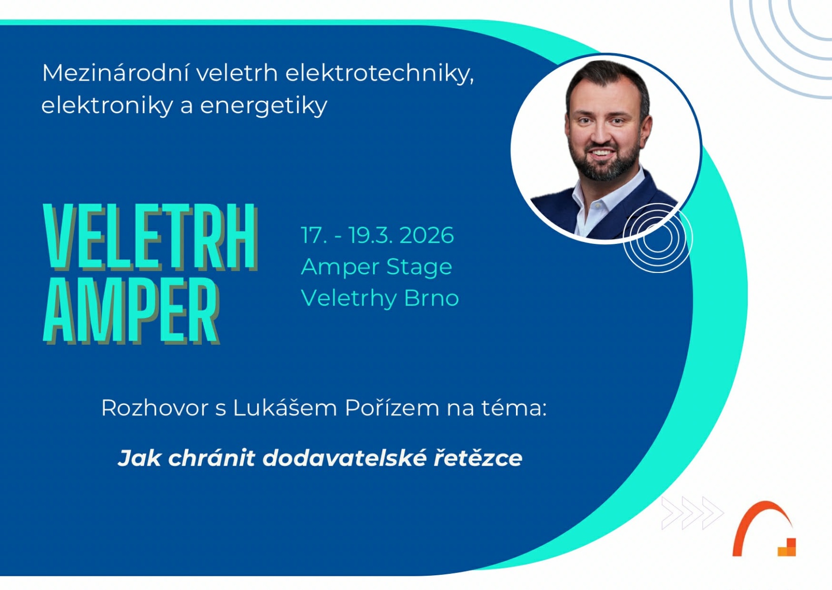 Rádi bychom Vás pozvali na Mezinárodní veletrh AMPER 2026, kde jsme přijali pozvání do odborné diskuze na AMPER STAGE a kde proběhne rozhovor s Lukášem Pořízem na téma Jak chránit dodavatelské řetězce?